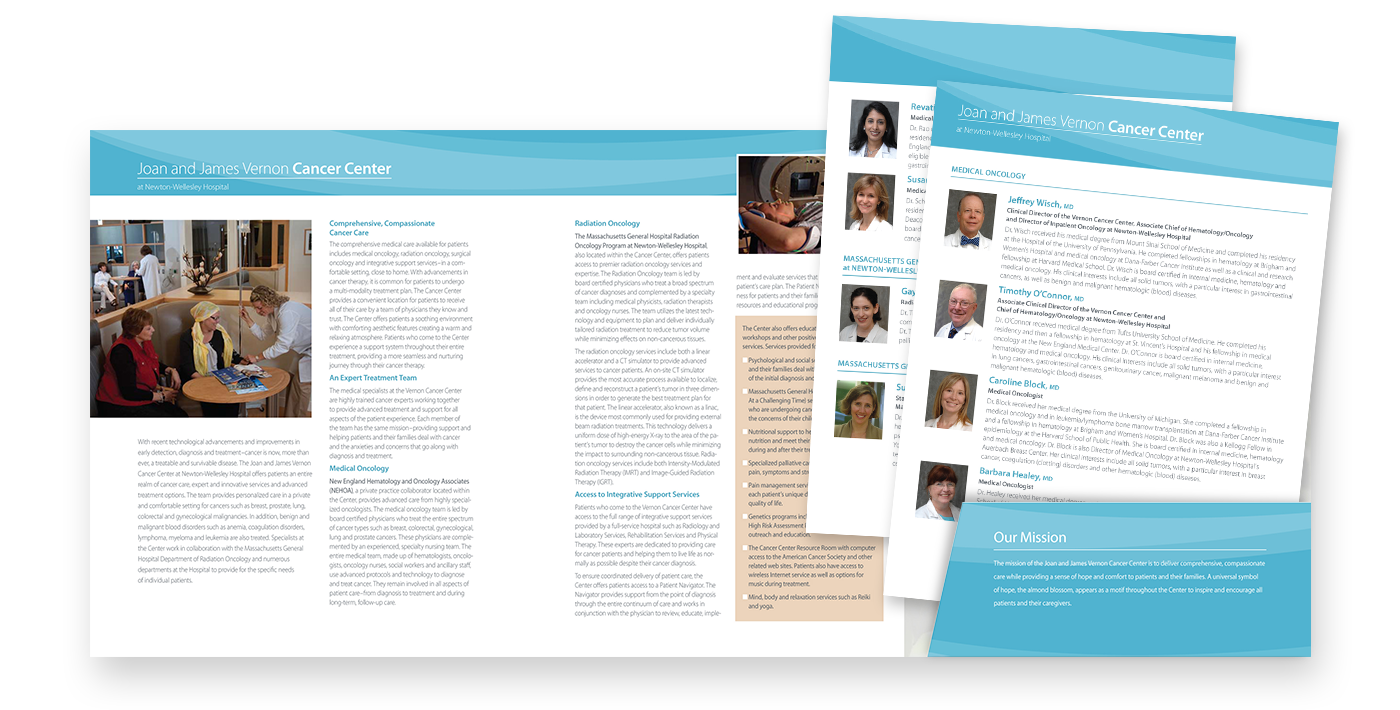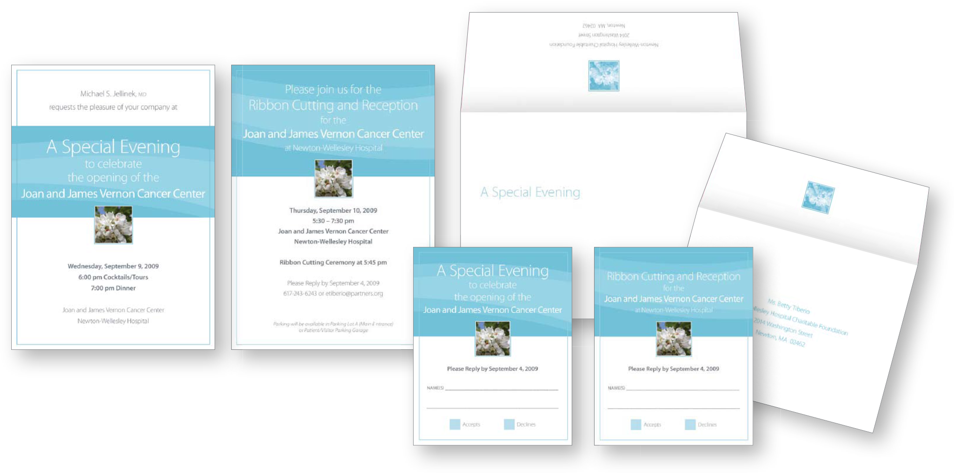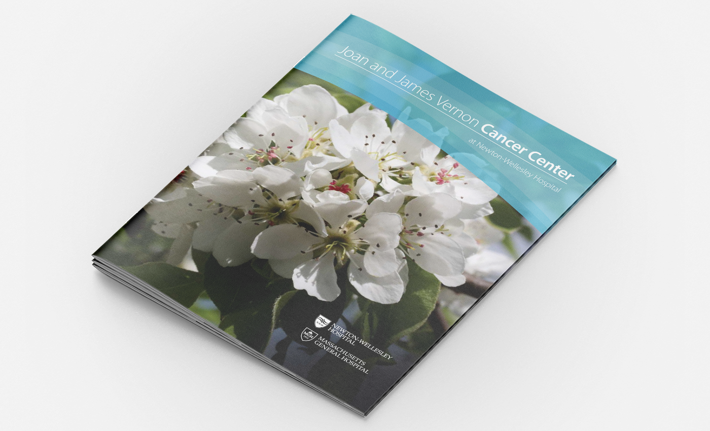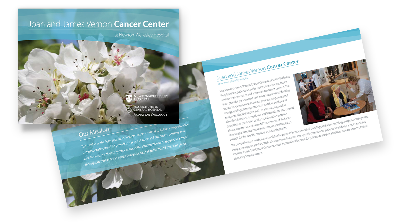 Enlisted by the hospital’s marketing team to create materials for the opening of their new wing, the MGH/Joan and James Vernon Cancer Center. The new creative needed to echo the existing collateral materials and include the almond blossom, a motif incorporated throughout the center.