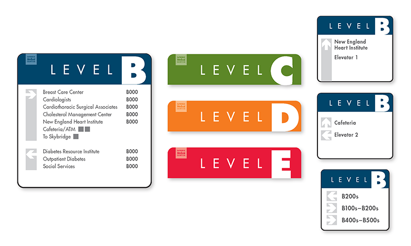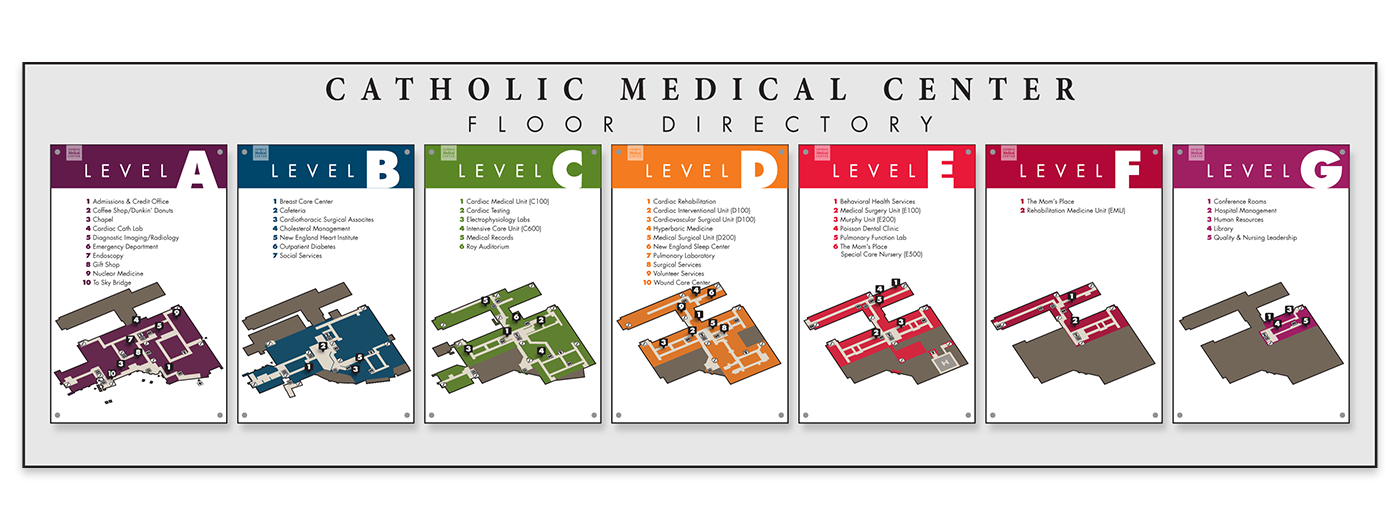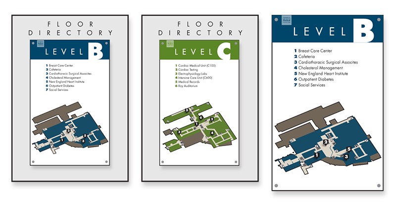 One of several design proposals to update the hospital’s wayfinding. Working within the space of the existing directory, signs are repositioned into a tighter group and mounted to frosted plexi. New sign art is sandwiched under clear plexi and held in place with aluminum hardware to allow easy updates. Starting with CMC eggplant, a new deep color range was selected for the floors. (Yes, the letter theme was already in use and integrated into the flooring.) New designs repurposed the existing directional signage.