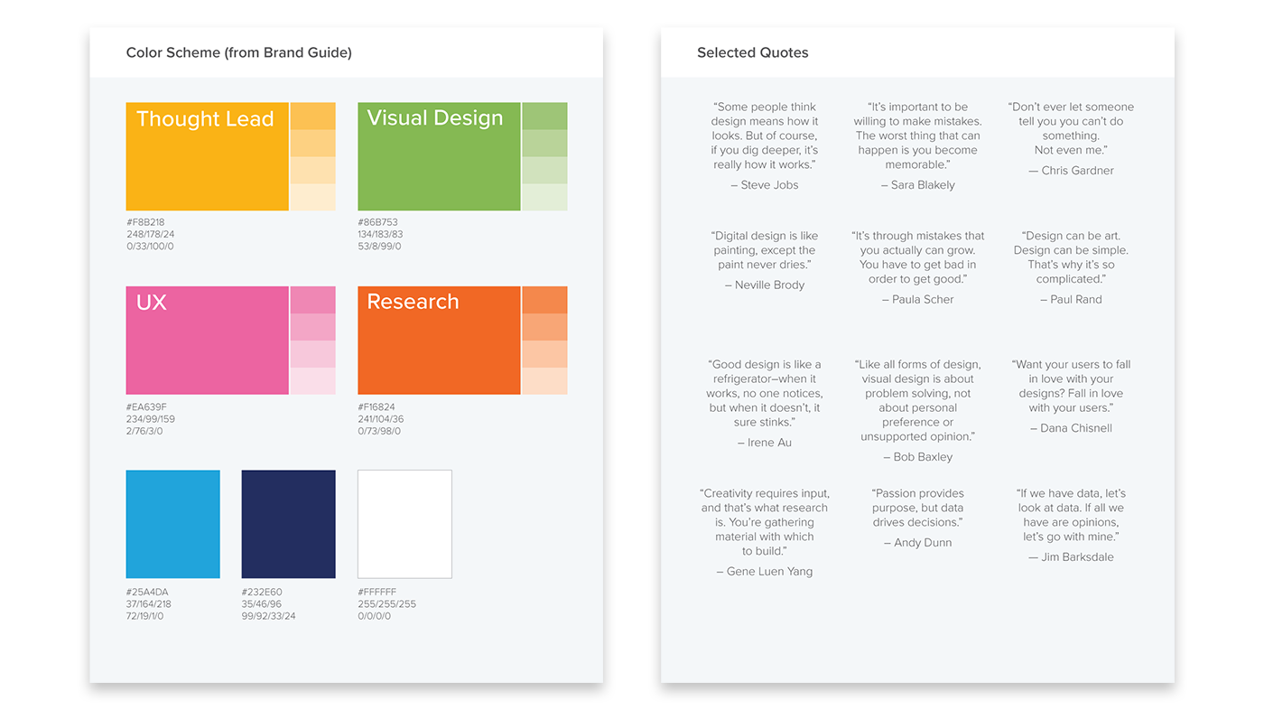 This UX team project was part promotion and part inspiration. Prompted the team to share favorite quotes from their favorite industry leaders and influencers. Once the final quotes were selected, I created these posters based on the company brand guide. The posters were displayed in common areas alongside materials from other departments to help build cross-team connections.
