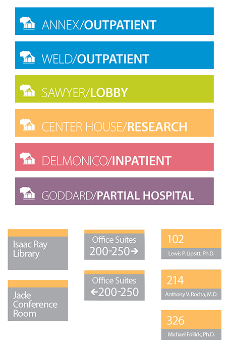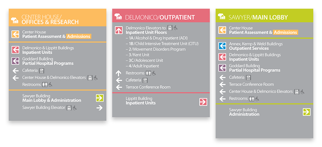 Navigating the hospital’s different buildings was, at times, difficult for patients and visitors. In Phase One, a color code design was introduced, drawing inspiration from the walking paths around the campus and along the Seekonk River. The new colors created a pathway for patients and their families to guide them to primary hospital services.